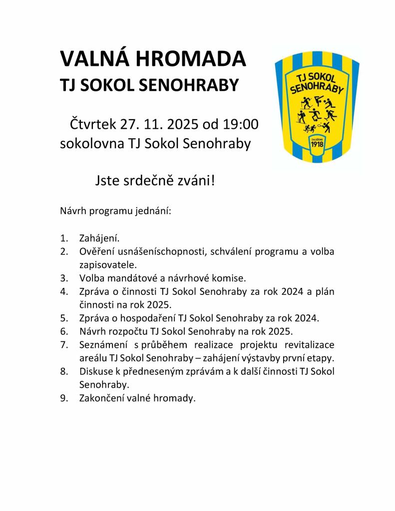 Valná hromada TJ Sokol Senohraby se koná ve čtvrtek 27. listopadu 2025 od 19:00. Akce se uskuteční v sokolovně, kde budou projednávány důležité body a návrhy programu jednání. Srdečně zveme všechny členy a příznivce na tuto významnou událost, kde máte možnost vyjádřit své názory a podílet se na chodu klubu.